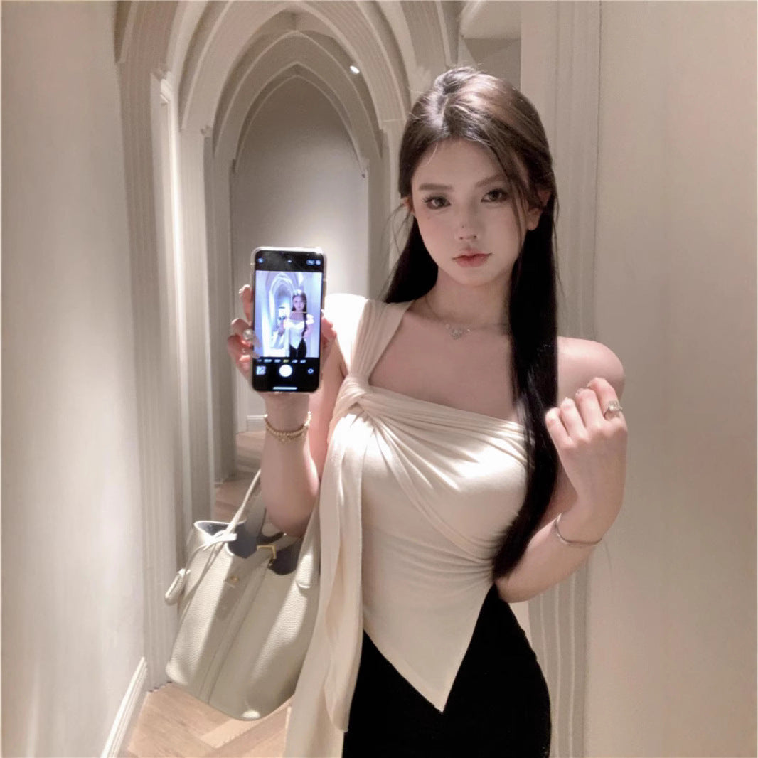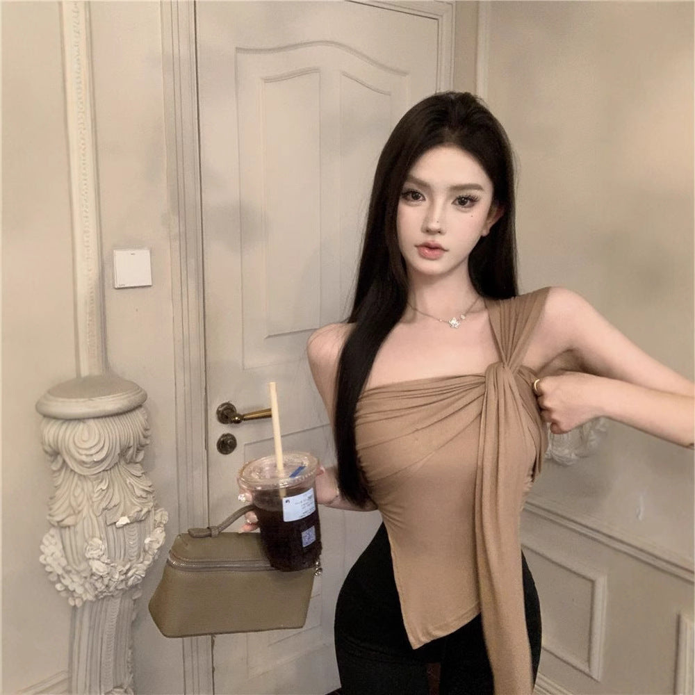 Irregular Shoulder Sling Vest Women's New Summer Folded Blouse Wear HZ1208