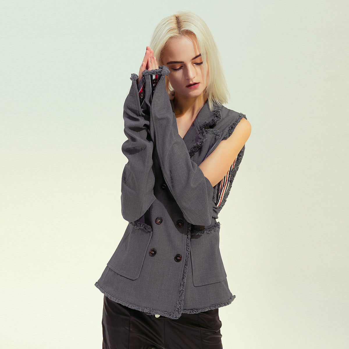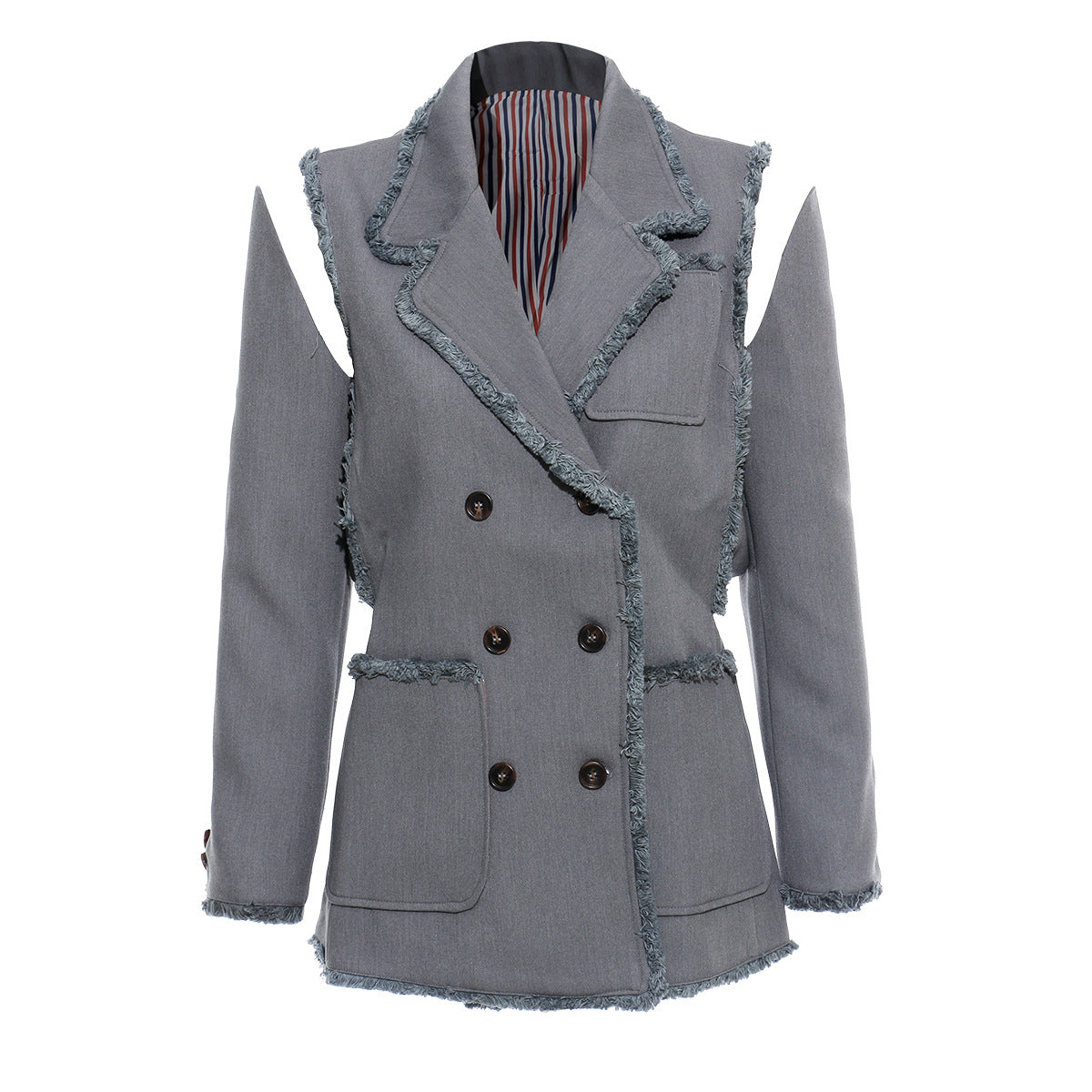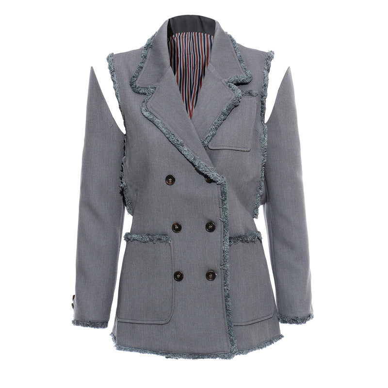 25 New Personality Tuxedo Side Side Shoulder Buckle Suit Broken Sleeve Ash Spliced Long-Sleeved Coat 1167 HZ1208