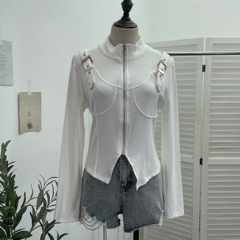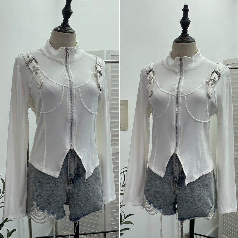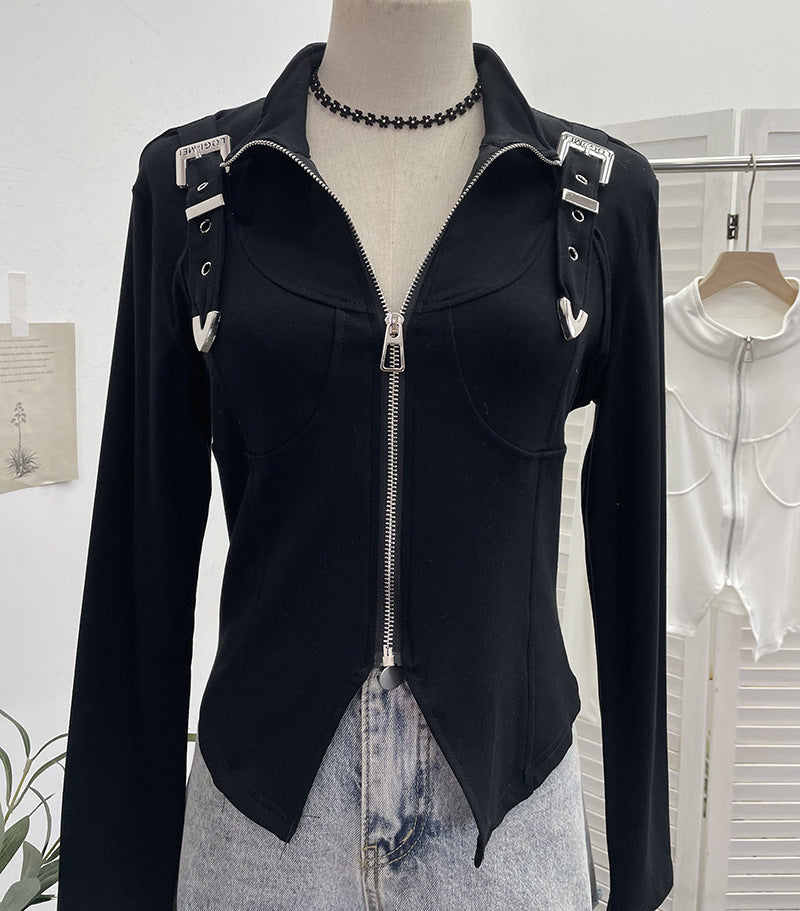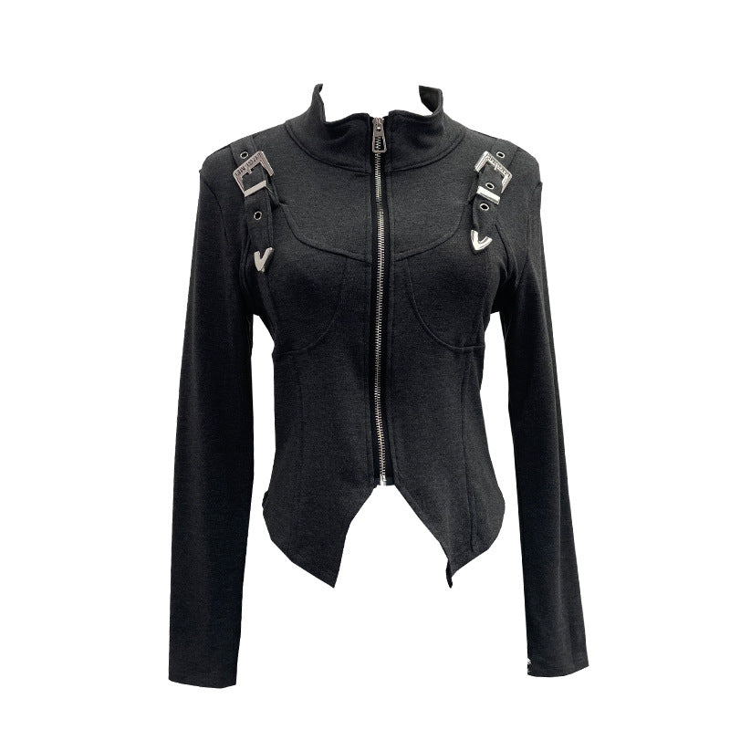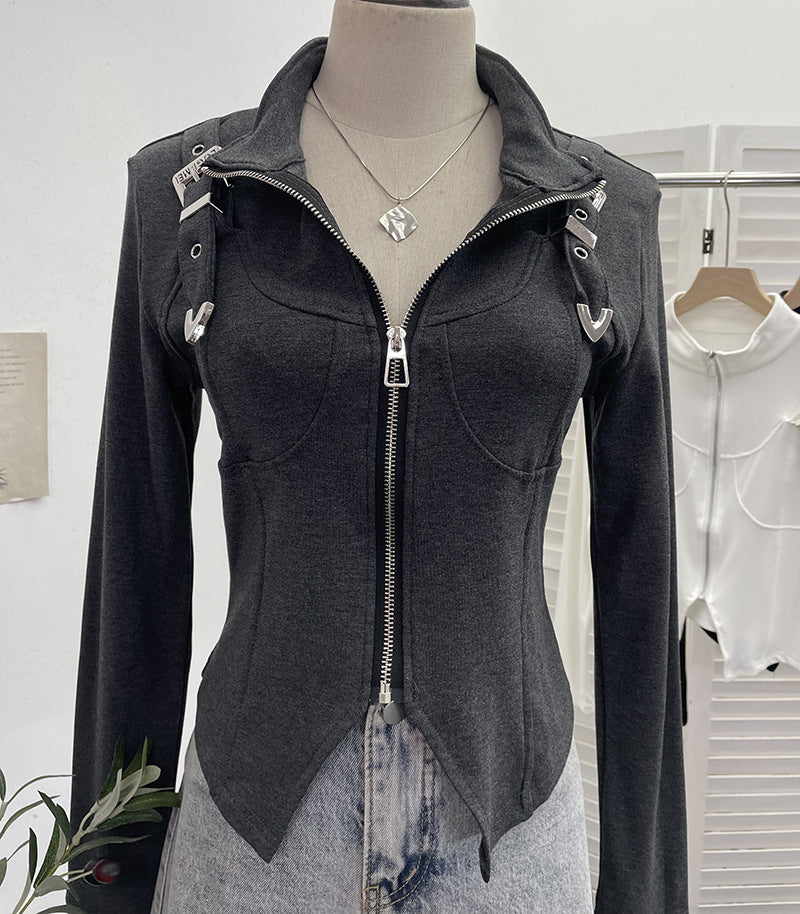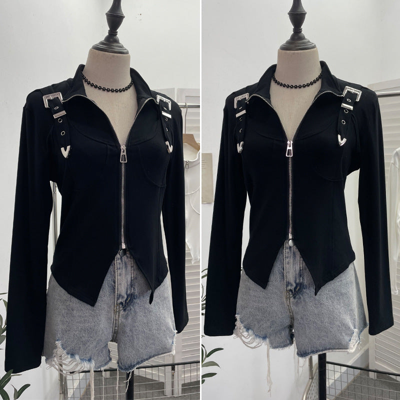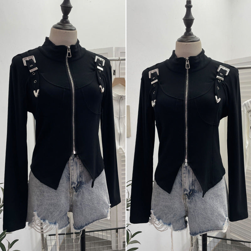 Real Shooting Irregular Zipper Collar Short Small Coat With Long Sleeves And Bottom Shirt 2680 HZ1208