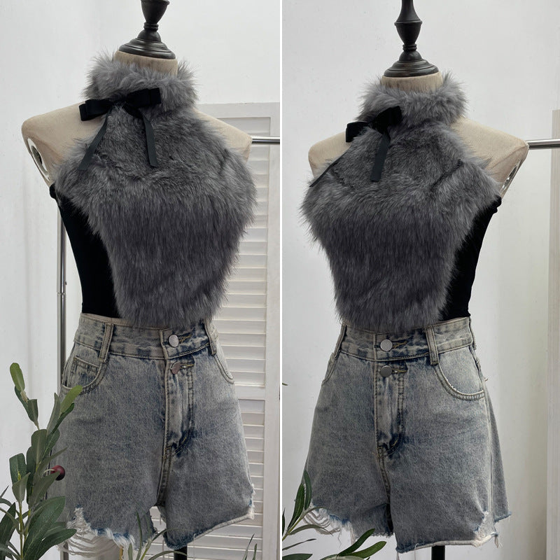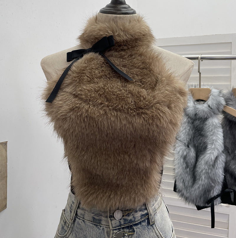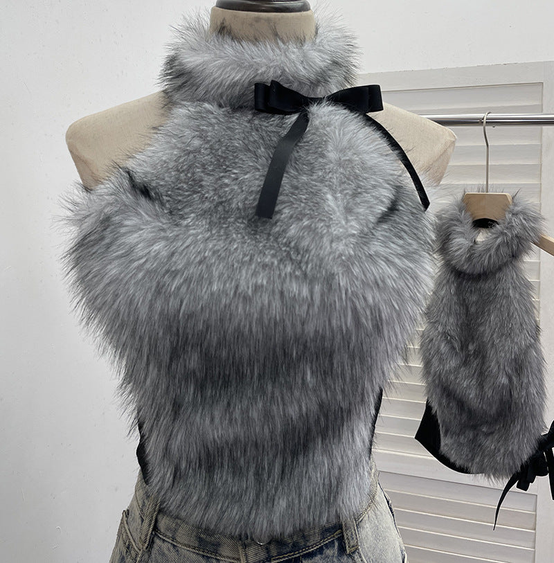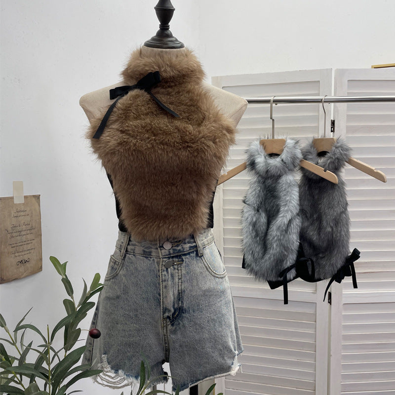 Real-Shot Bow Decorative Hair Splicing Elastic Hanging Neck Vest Outside Wearing Hairy Short Grinding Coat 2791 HZ1208