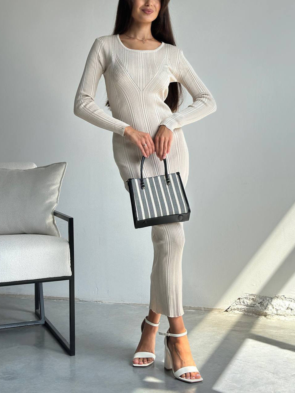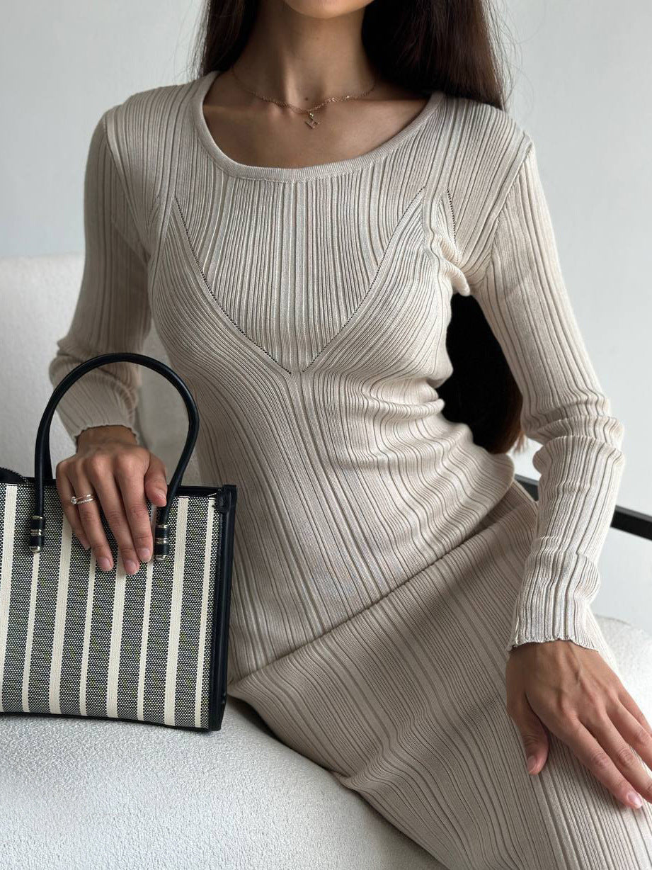 Elegant Wind Solid Color Knitted Dress Female Spring And Autumn Temperament Waist Long Sleeve Long Skirt HZ1208