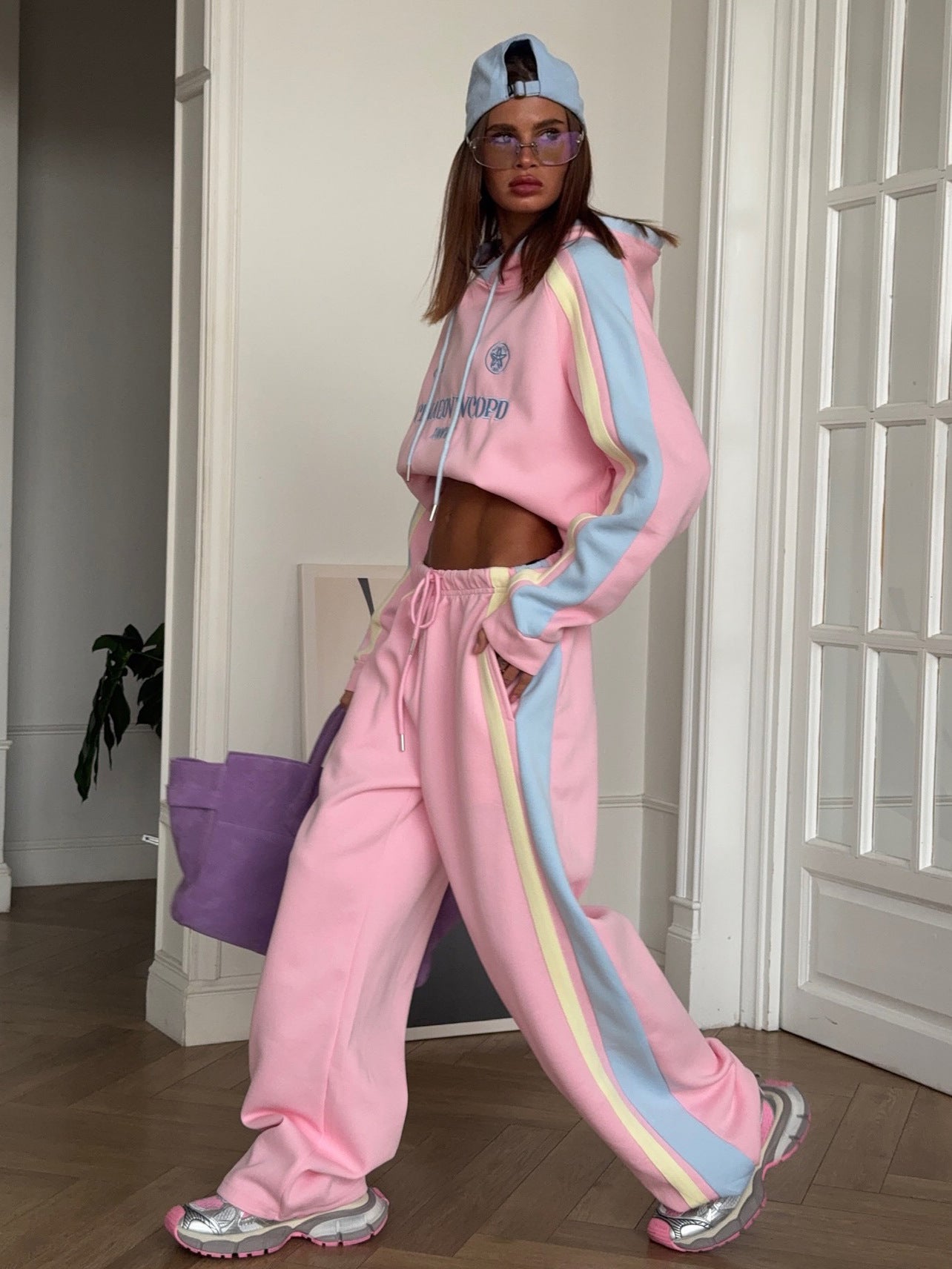 Street Wind Hit Striped Decorative Letters Embroidered Hoodie Casual Loose Trouser Set Fashion HZ1208