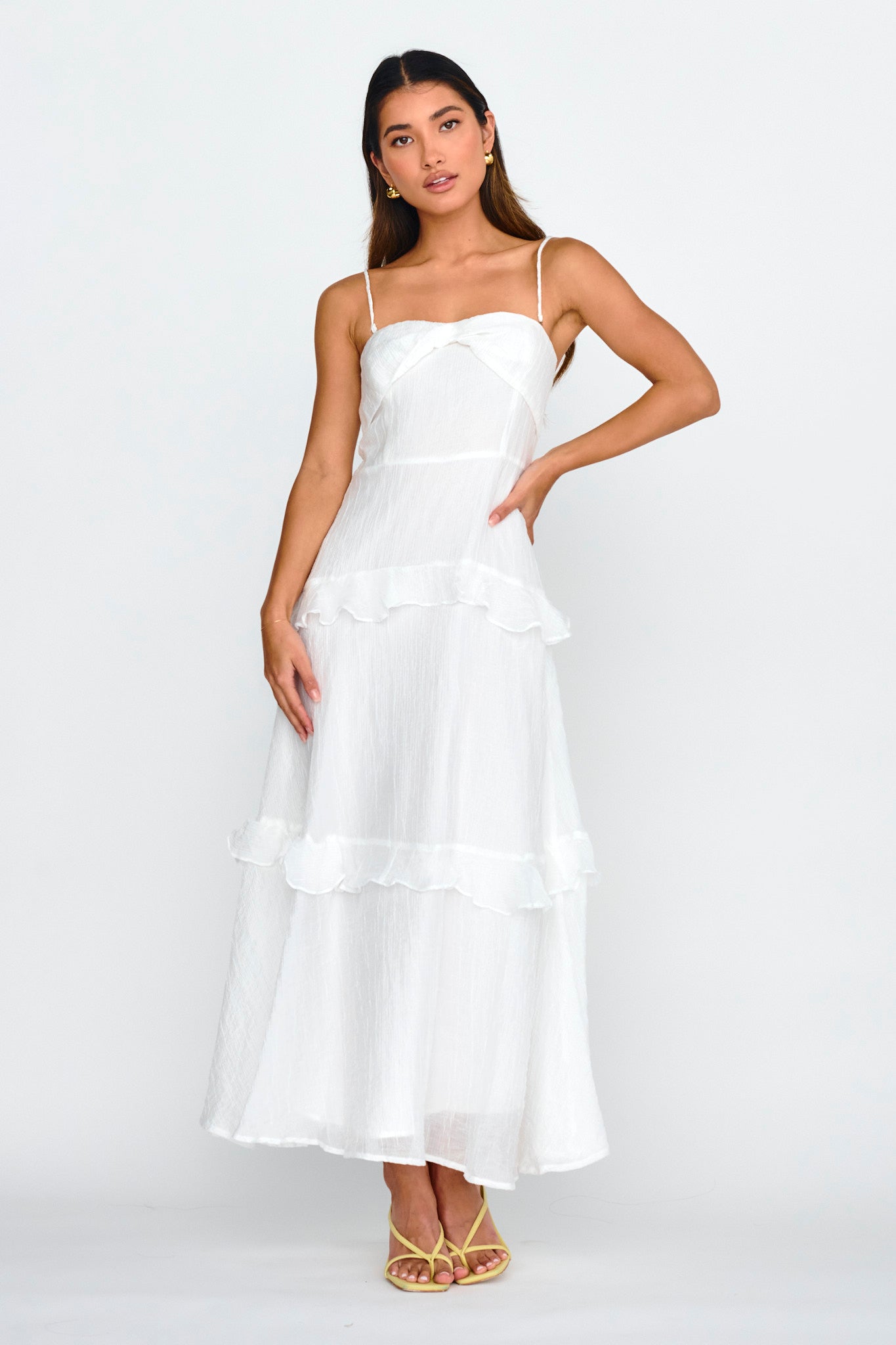 Twirl through your day in our pretty Rise & Glow dress. Featuring a textured fabric and frill trim. It's perfect for weekend brunch with your besties. Team it with a saddle bag and mules for a look that will turn heads.