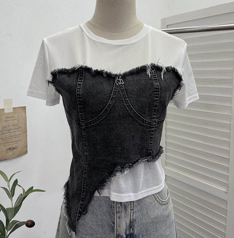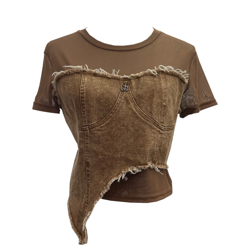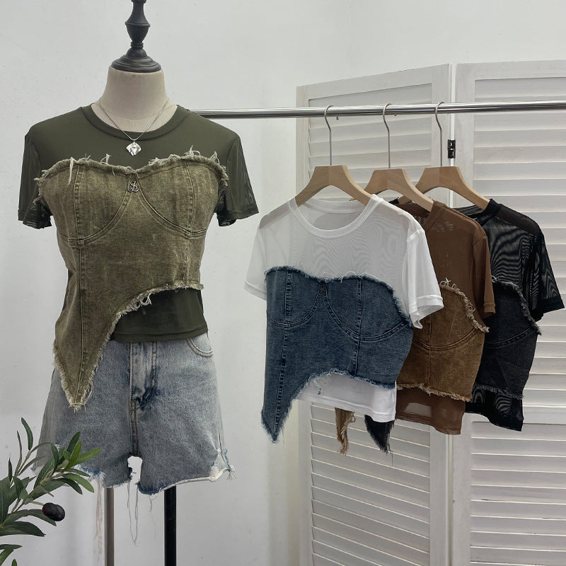 Solid Shooting Denim Splicing Mesh Yarn Short-Sleeved T-Shirt Summer Dress Irregularly Short High-Waist Repair Body Coat 26171 HZ1208