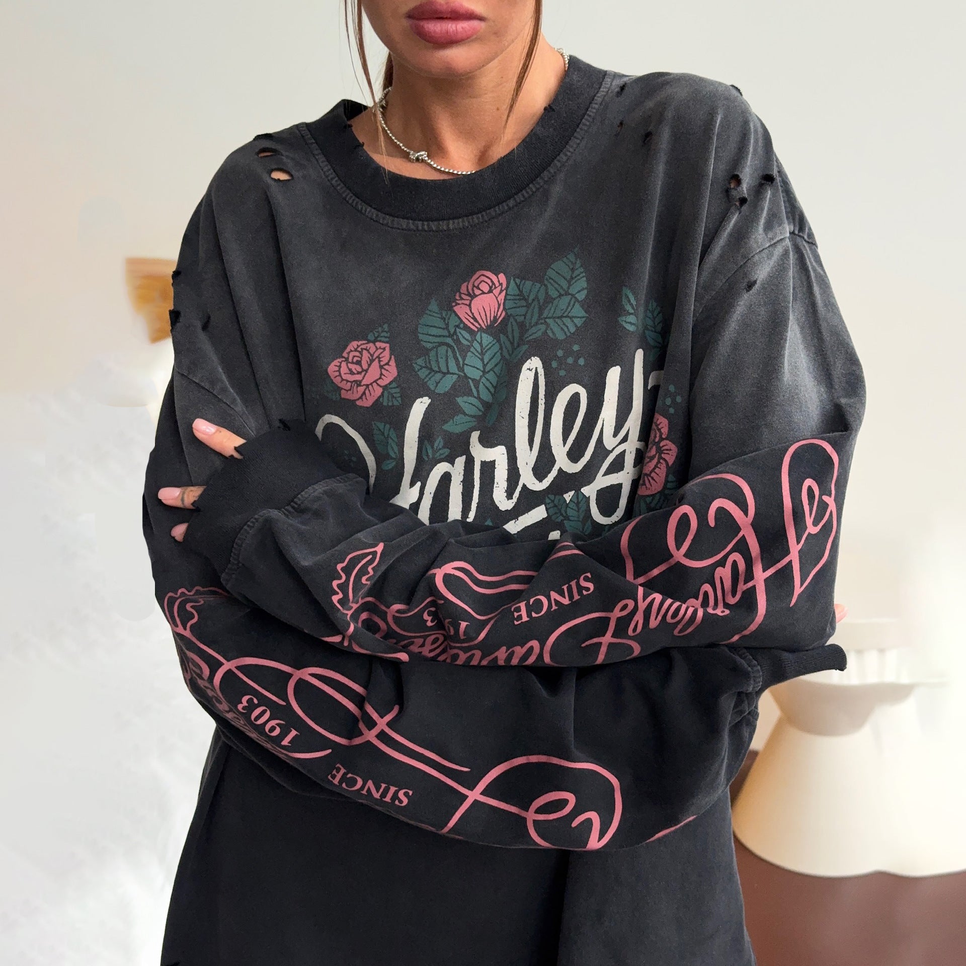 Vintage Cut To Make Old Print Women's Rose Letter Print Street Cool Lazy Slack Feel Top HZ1208